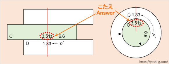 (2)C 尺とD 尺の基線が合っているのを確認して、 \( \rho ‘ \) にカーソル線を合わせます。C 尺とD 尺のどちらに \( \rho ‘ \) があっても大丈夫です。